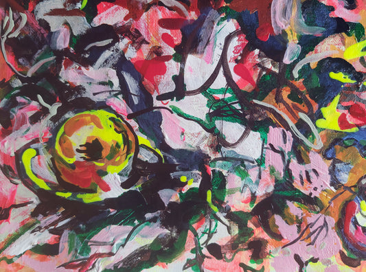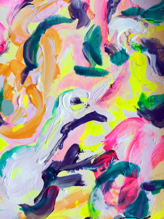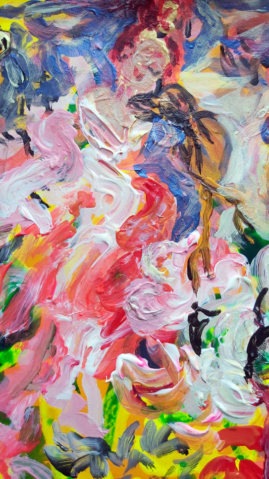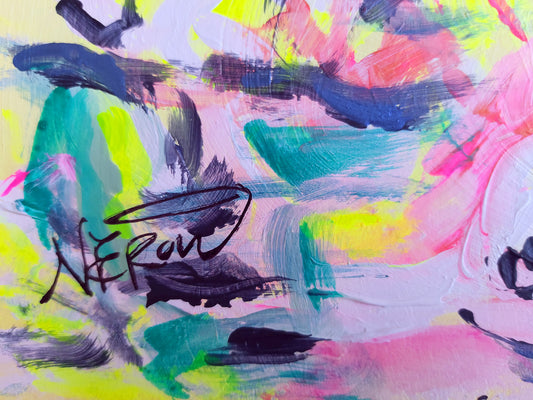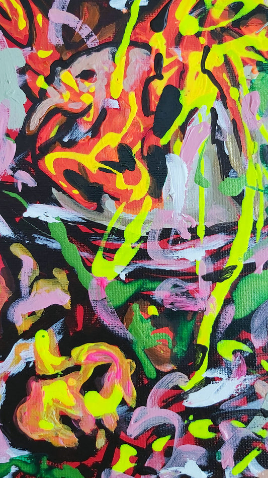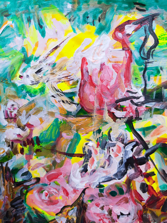 The Avium Caos series follows in the footsteps of Garden of Delight, continuing the exploration of fantastical and dreamlike worlds inspired by the vibrant universe of Hieronymus Bosch. This new series was born from an immersive experience on Howe Island, where the lively ecosystem, home to hundreds of birds, influenced each brushstroke. Created outdoors by the water’s edge, these works capture the essence of this rich soundscape, where the songs of mockingbirds, the dance of terns, and the murmurs of countless other birds blend into a natural symphony.
