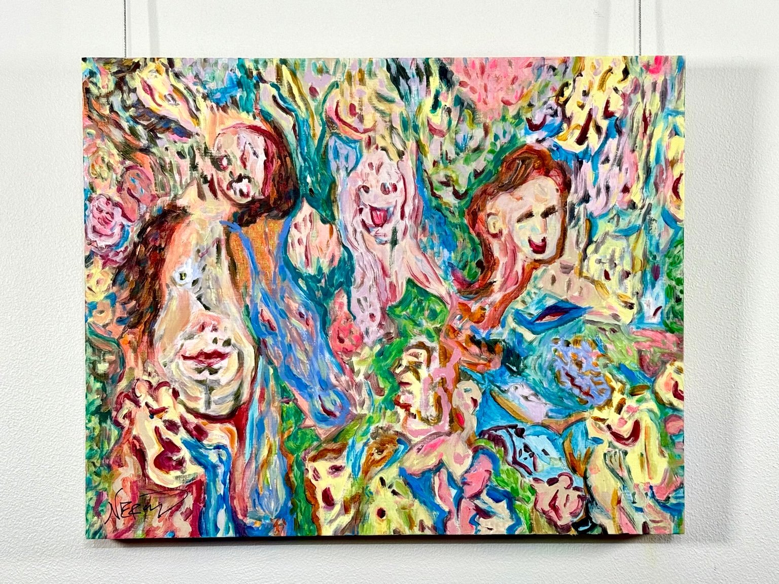 Part of the Meat and Petals series, this work explores the tension between vulnerability and density, sensuality and abstraction. Layered marks and chromatic shifts create a rhythmic surface, evoking growth, breath, and accumulation. The painting unfolds intuitively, allowing figures to appear, overlap, and recede, as if shaped by an inner pulse rather than a fixed narrative.